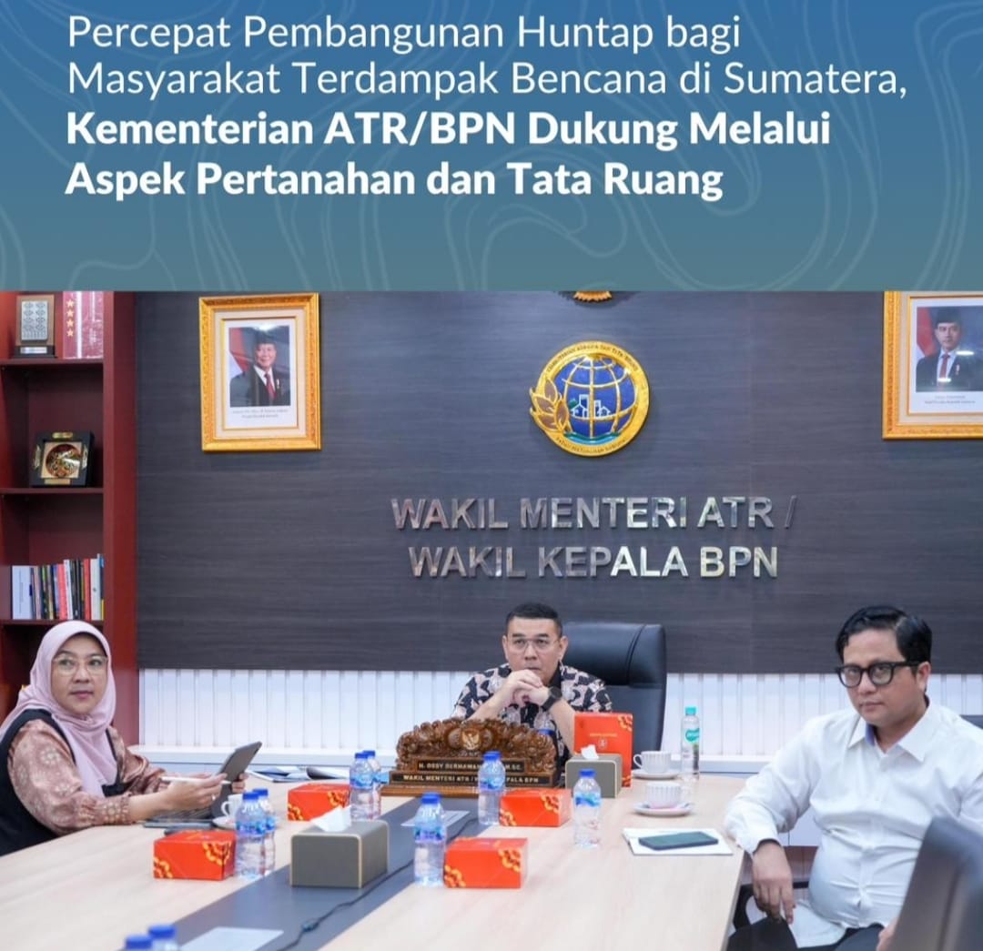 “Melalui aspek pertanahan dan tata ruang, kami membantu pemerintah daerah di Sumatera agar pembangunan Huntap dapat dipercepat. Kami memastikan lokasi yang ditetapkan memiliki kepastian hukum (sertipikat) dan tidak bermasalah,” ujar Wakil Menteri (Wamen) ATR/Wakil Kepala (Waka) BPN, Ossy Dermawan, dalam rapat yang berlangsung secara daring, Minggu (28/12/2025) malam.