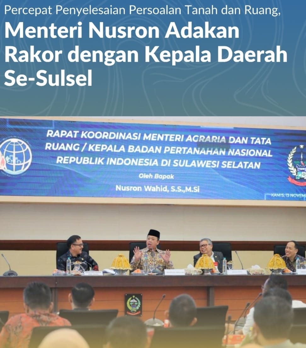Makassar, Jurnal Minang. Menteri Agraria dan Tata Ruang/Kepala Badan Pertanahan Nasional (ATR/BPN), Nusron Wahid, memimpin Rapat Koordinasi (Rakor) bersama kepala daerah se-Provinsi Sulawesi Selatan (Sulsel), di Kantor Gubernur Sulsel pada Kamis (13/11/2025). Rakor ini merupakan bagian dari rangkaian kunjungan kerja nasionalnya ke berbagai provinsi. Tujuannya, untuk memperkuat sinergi antara pusat dan daerah dalam menyelesaikan persoalan pertanahan dan tata ruang di lapangan.