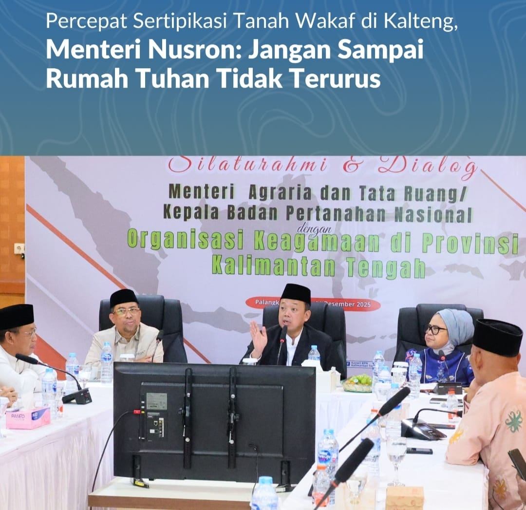 Palangka Raya , Jurnal Minang. Menteri Agraria dan Tata Ruang/Kepala Badan Pertanahan Nasional (ATR/BPN), Nusron Wahid, mempercepat sertipikasi tanah wakaf dan rumah ibadah dengan mendorong seluruh organisasi keagamaan untuk segera mendaftarkan dan menyertipikatkan tanah yang dimiliki umat. Langkah ini dinilai penting untuk memberikan kepastian hukum serta menjaga aset keagamaan agar tidak menimbulkan persoalan di kemudian hari.