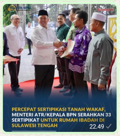 “Alhamdulillah hari ini kita melaksanakan penyerahan sertipikat sebagai tanda legalitas atau kekuatan hukum daripada tanah-tanah wakaf kita. Saya harap, Pak Kanwil, ini perlu ada effort khusus untuk mempercepat sertipikasi tanah wakaf di Sulawesi Tengah,” ujar Menteri Agraria dan Tata Ruang/Kepala Badan Pertanahan Nasional (ATR/BPN), Nusron Wahid, di Kantor Wilayah BPN Provinsi Sulawesi Tengah.