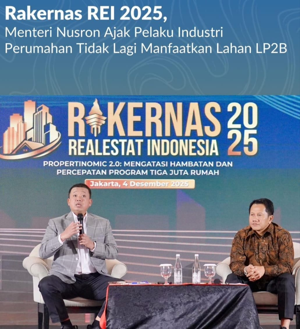 Jakarta , Jurnal Minang. Menteri Agraria dan Tata Ruang/Kepala Badan Pertanahan Nasional (ATR/BPN), Nusron Wahid, menekankan pentingnya perubahan pola pengadaan tanah oleh pelaku industri perumahan agar lebih selaras dengan agenda ketahanan pangan nasional. Pesan itu ia sampaikan saat berbicara di hadapan ratusan pelaku industri perumahan, dalam Rapat Kerja Nasional (Rakernas) Realestat Indonesia (REI) Tahun 2025, Kamis (04/12/2025).