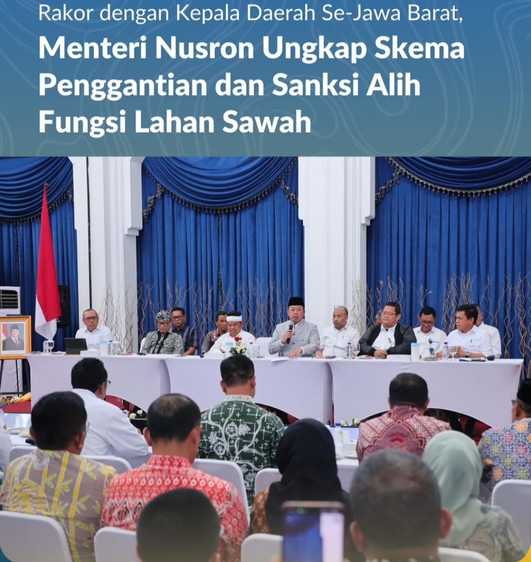 Bandung, Jurnal Minang. Menteri Agraria dan Tata Ruang/Kepala Badan Pertanahan Nasional (ATR/BPN), Nusron Wahid, menegaskan bahwa alih fungsi Lahan Pertanian Pangan Berkelanjutan (LP2B) tidak bisa dilakukan secara sembarangan. Saat Rapat Koordinasi bersama kepala daerah se-Jawa Barat pada Kamis (18/12/2025), ia memaparkan secara rinci skema penggantian lahan sekaligus sanksi tegas bagi pihak yang melanggar ketentuan alih fungsi lahan.