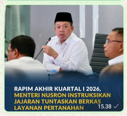 Jakarta, Jurnal Minang. Kementerian Agraria dan Tata Ruang/Badan Pertanahan Nasional (ATR/BPN) terus melanjutkan proses penyelesaian berkas layanan pertanahan berdasarkan kurun waktu tertentu. Progres ini telah digenjot sejak kuartal IV tahun 2025. Dalam Rapat Pimpinan (Rapim) yang berlangsung pada Kamis (16/04/2026), Menteri ATR/Kepala BPN, Nusron Wahid, menginstruksikan jajaran agar menyelesaikan berkas sesuai target yang telah disepakati.