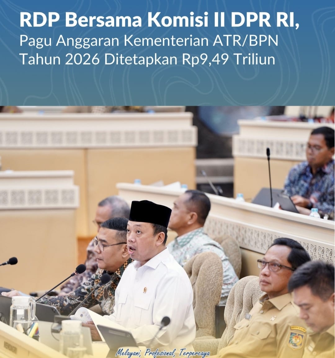 Jakarta, Jurnal Minang. Menteri Agraria dan Tata Ruang/Kepala Badan Pertanahan Nasional (ATR/BPN), Nusron Wahid, menghadiri Rapat Dengar Pendapat (RDP) bersama Komisi II Dewan Perwakilan Rakyat Republik Indonesia (DPR RI), di Gedung Nusantara, Jakarta, Senin (15/09/2025). Pada rapat tersebut ditetapkan pagu anggaran Kementerian ATR/BPN Tahun 2026 sebesar Rp9,499 triliun.