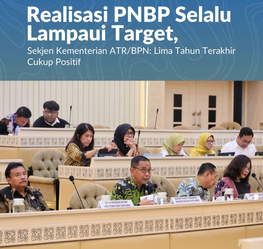 Jakarta, Jurnal Minang. Sekretaris Jenderal (Sekjen) Kementerian Agraria dan Tata Ruang/Badan Pertanahan Nasional (ATR/BPN), Pudji Prasetijanto Hadi, menyampaikan laporan realisasi Penerimaan Negara Bukan Pajak (PNBP) Kementerian ATR/BPN kepada Panitia Kerja (Panja) Pengawasan PNBP Komisi II Dewan Perwakilan Rakyat Republik Indonesia (DPR RI), Selasa (16/09/2025). Dalam sambutannya, ia menegaskan bahwa capaian PNBP dalam lima tahun terakhir menunjukkan tren yang cukup positif serta selalu melampaui target.