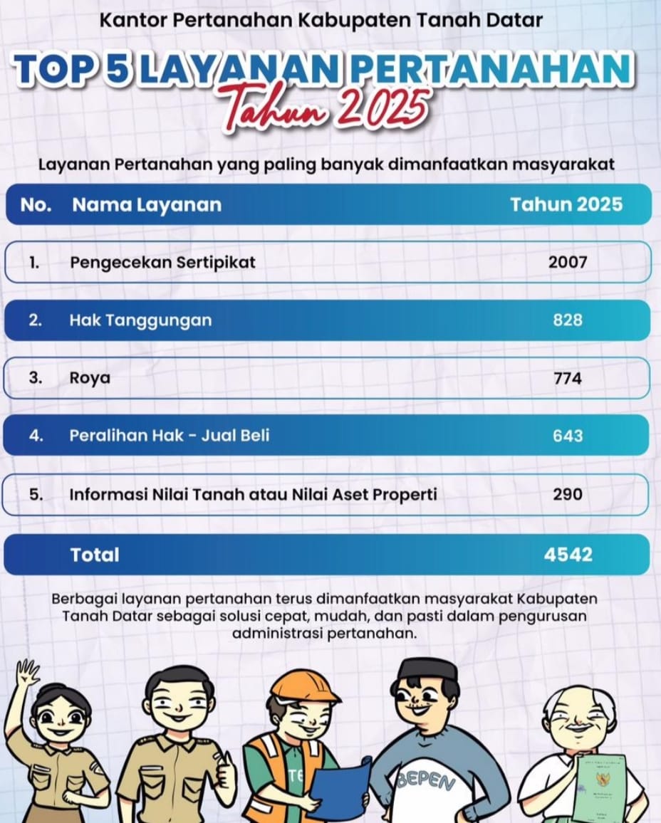 Batusangkar, Jurnal Minang. Selama Tahun 2025, Kantor Pertanahan Kabupaten Tanah Datar mencatat penerimaan sebanyak 14.963 berkas permohonan pelayanan pertanahan dari masyarakat. Capaian ini mencerminkan tingginya kebutuhan serta kepercayaan masyarakat terhadap layanan pertanahan yang diselenggarakan oleh Kantor Pertanahan Kabupaten Tanah Datar.