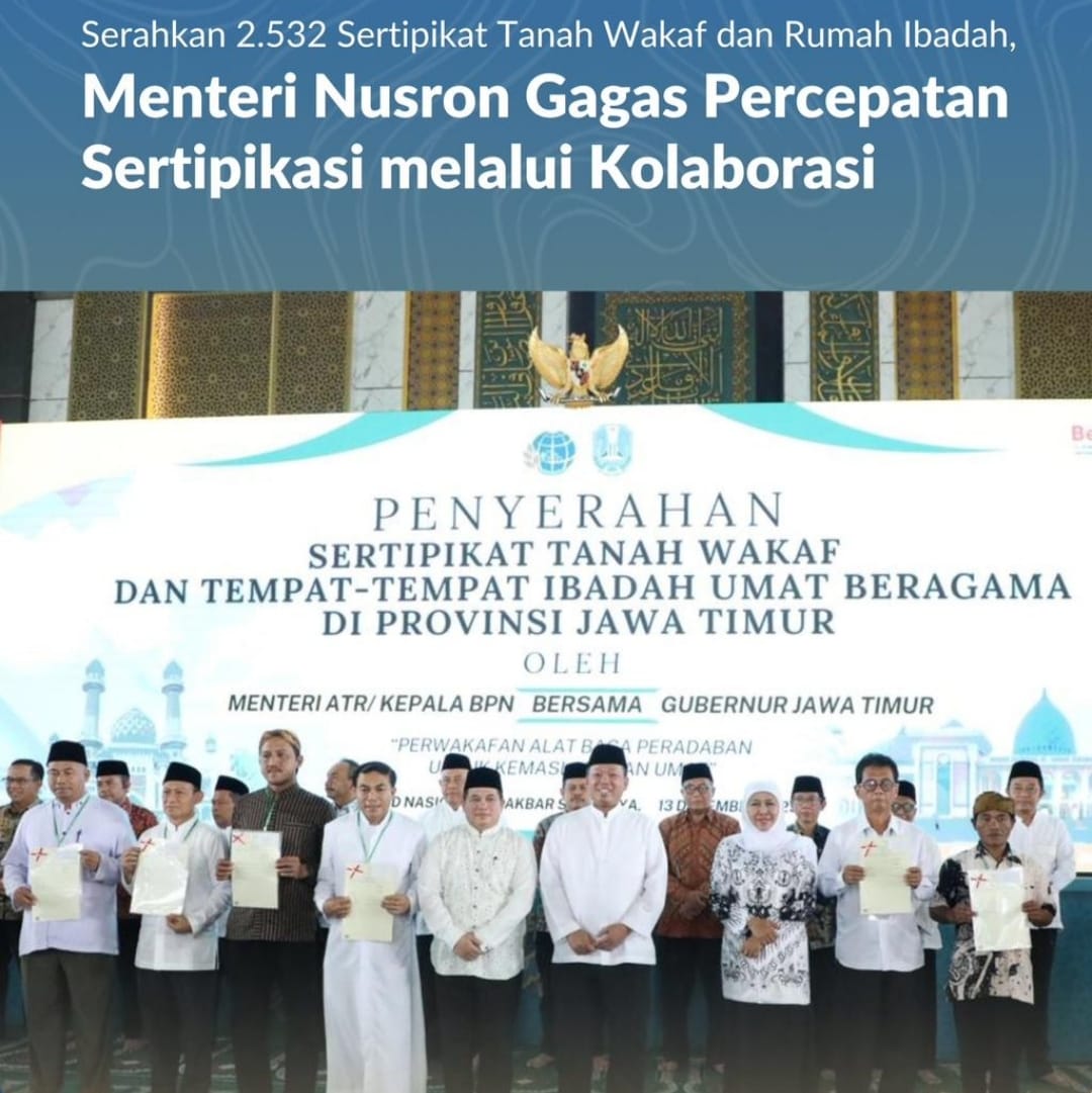 Surabaya, Jurnal Minang. Menteri Agraria dan Tata Ruang/Kepala Badan Pertanahan Nasional (ATR/BPN), Nusron Wahid, bersama Gubernur Jawa Timur, Khofifah Indar Parawansa, menyerahkan sebanyak 2.532 sertipikat tanah wakaf dan rumah ibadah. Penyerahan tersebut berlangsung di Masjid Nasional Al-Akbar Surabaya, Sabtu (13/12/2025). Dalam kesempatan itu, Menteri Nusron menegaskan pentingnya kolaborasi antara pemerintah pusat dan daerah, lembaga keagamaan, serta perguruan tinggi guna mempercepat pendaftaran tanah wakaf dan rumah ibadah di Jawa Timur.
