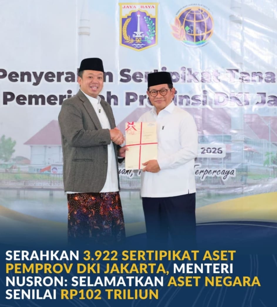 Jakarta, Jurnal Minang. Menteri Agraria dan Tata Ruang/Kepala Badan Pertanahan Nasional (ATR/BPN), Nusron Wahid, menyerahkan 3.922 sertipikat hak atas tanah milik Pemerintah Provinsi DKI Jakarta kepada Gubernur DKI Jakarta, Pramono Anung, di Masjid Raya K.H. Hasyim Asy’ari, Jumat (13/02/2026). Penyerahan sertipikat sekaligus menandakan penyelamatan aset negara dengan total nilai mencapai Rp102 triliun.