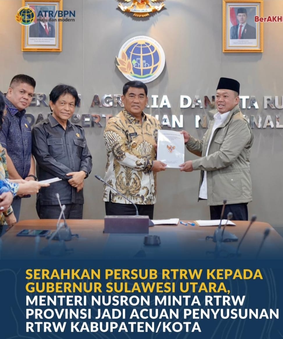 Jakarta, Jurnal Minang. Menteri Agraria dan Tata Ruang/Kepala Badan Pertanahan Nasional (ATR/BPN), Nusron Wahid menyerahkan Surat Persetujuan Substansi (Persub) Rencana Tata Ruang Wilayah (RTRW) Provinsi Sulawesi Utara Tahun 2025-2044 kepada Gubernur Sulawesi Utara, Yulius Selvanus pada Kamis (19/02/2025), di Kantor Kementerian ATR/BPN, Jakarta. Dalam kesempatan tersebut, Menteri Nusron menegaskan bahwa RTRW Provinsi harus menjadi acuan utama bagi penyusunan RTRW Kabupaten/Kota, untuk mencegah tumpang tindih dan penyimpangan pemanfaatan lahan.