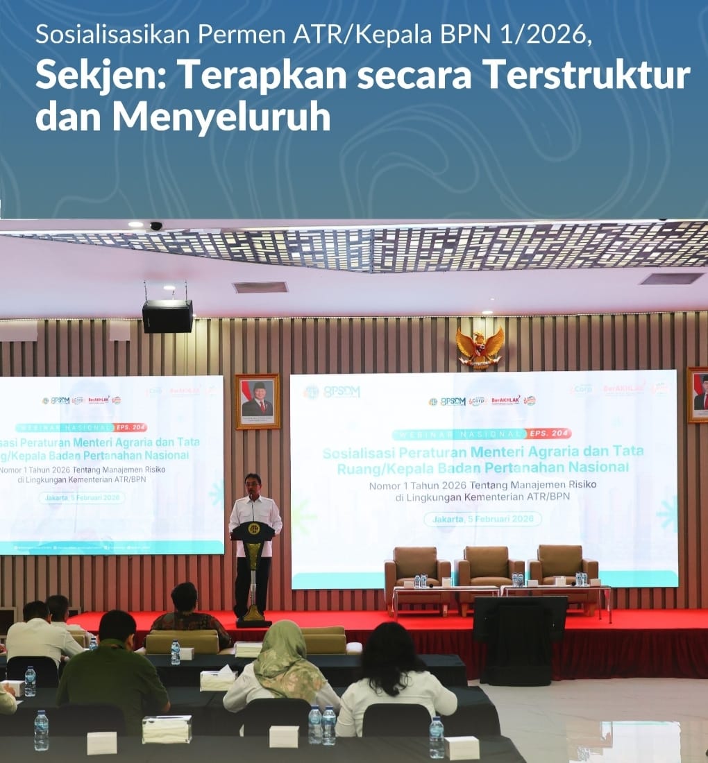 Jakarta, Jurnal Minang. Kementerian Agraria dan Tata Ruang/Badan Pertanahan Nasional (ATR/BPN) memperkuat penerapan manajemen risiko dalam meningkatkan kualitas pelayanan publik melalui terbitnya Peraturan Menteri (Permen) ATR/Kepala BPN Nomor 1 Tahun 2026 tentang Manajemen Risiko. Peraturan tersebut menjadi fondasi tata kelola organisasi yang terintegrasi, sistematis, dan berkelanjutan. Untuk meningkatkan pemahaman jajaran terhadap kebijakan tersebut, Kementerian ATR/BPN menggelar Webinar Sosialisasi Permen ATR/Kepala BPN 1/2026 tentang Manajemen Risiko, secara daring dan luring di Aula Prona, Jakarta, Kamis (05/02/2026).