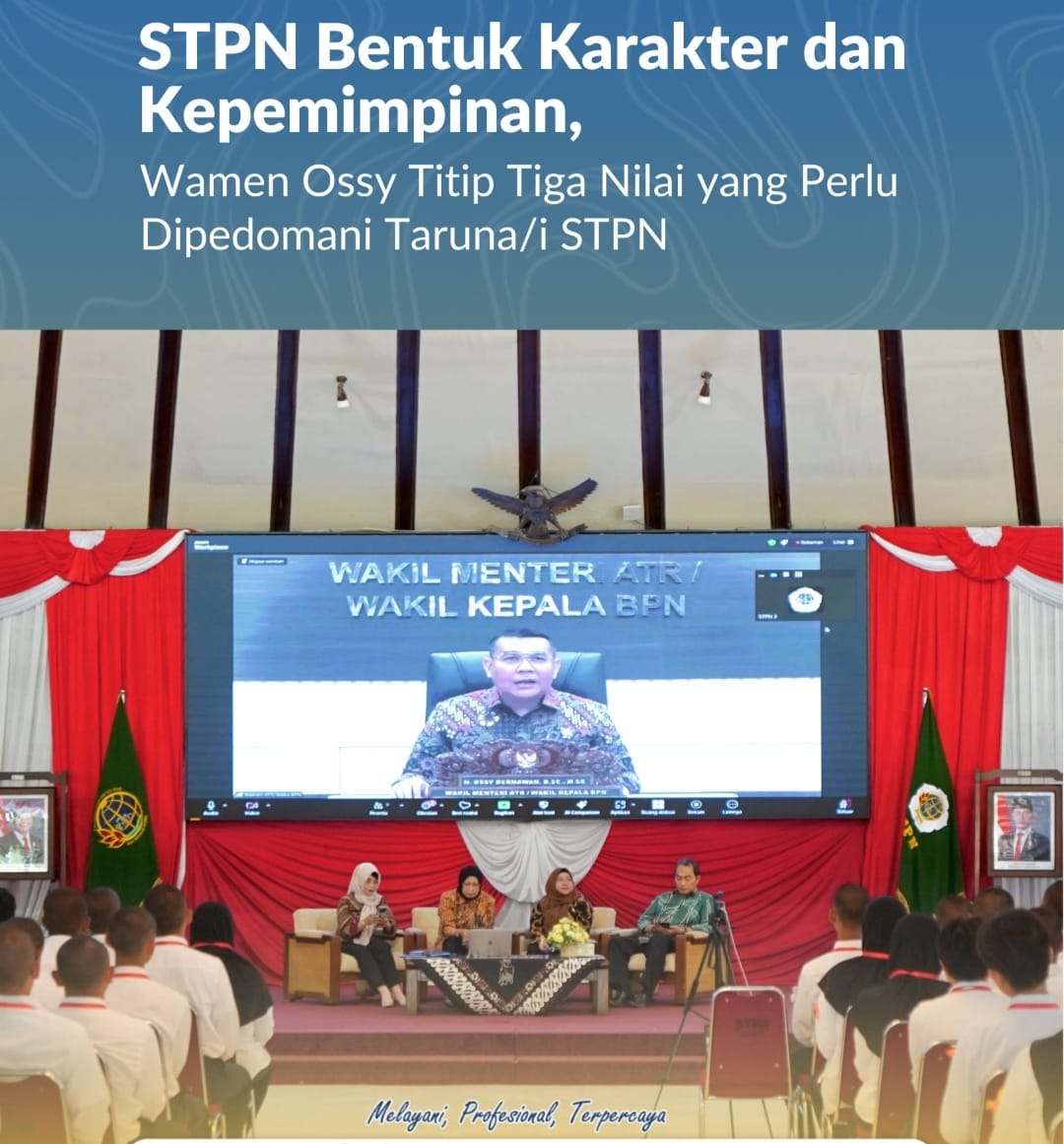 “STPN ini bukan sekadar proses menuntut ilmu, melainkan juga pembentukan karakter dan juga kepemimpinan, serta menjadi panggilan pengabdian kita kepada bangsa dan negara,” tutur Wamen ATR/Waka BPN secara daring kepada taruna baru STPN.