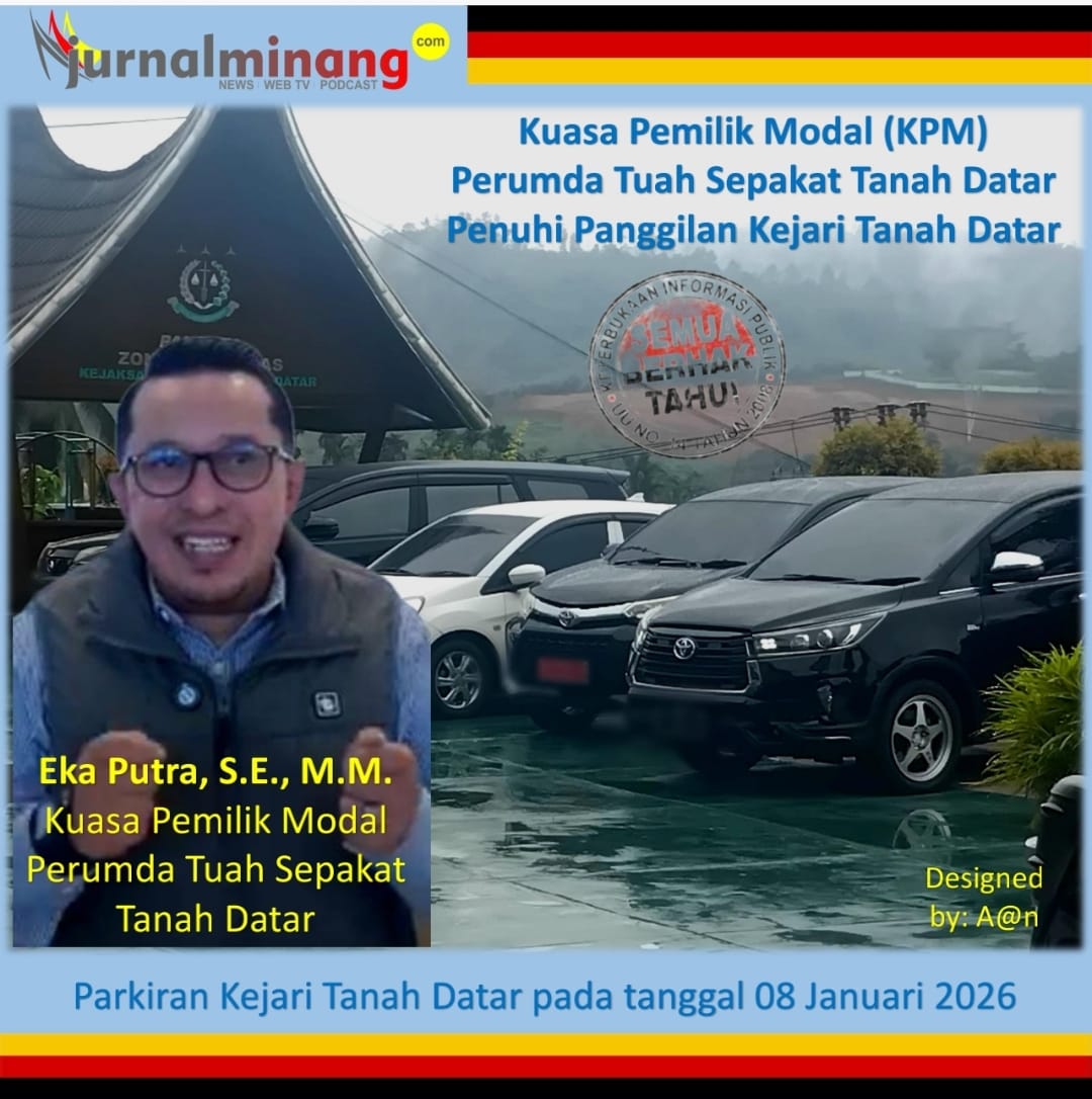Kali ini terlihat Kuasa Pemilik Modal (KPM) Perumda Tuah Sepakat, Eka Putra, S.E., M.M., datang memenuhi panggilan Kejari Tanah Datar guna memberikan keterangan seputar masalah yang membelit Perumda Tuah Sepakat tersebut pada Kamis, 08 Januari 2026 pagi.