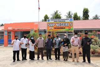 DI SMPN 5 Payakumbuh yang berlokasi di Kelurahan Tiakar, para wakil rakyat bersama Kadis Pendidikan diwakili Kabid PAUD dan PNFI Syafni Hasni dan Kasi Sapras Dani Yuliadi disambut Kepala SMPN 5 Payakumbuh Ade Chandra dan jajarannya.