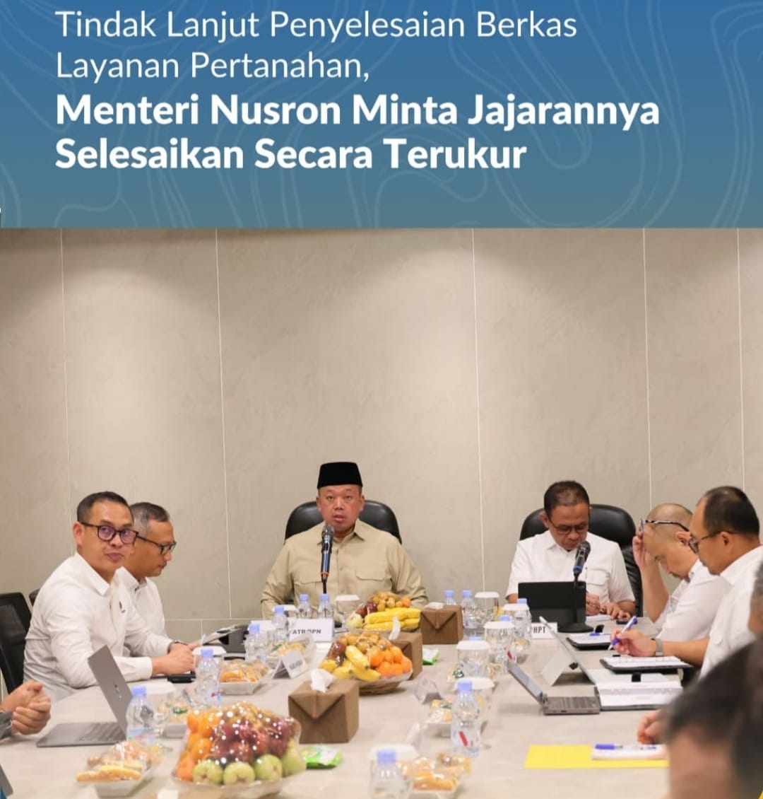 Jakarta, Jurnal Minang. Menteri Agraria dan Tata Ruang/Kepala Badan Pertanahan Nasional (ATR/BPN), Nusron Wahid kembali membahas tindak lanjut penyelesaian berkas yang telah menjadi prioritas sejak kuartal IV tahun 2025. Dalam arahannya, Menteri Nusron meminta seluruh jajaran untuk mengelompokkan berkas layanan pertanahan berdasarkan tahun pengajuan agar proses penyelesaiannya dapat dilakukan secara terukur dan sesuai tenggat waktu yang telah ditetapkan.