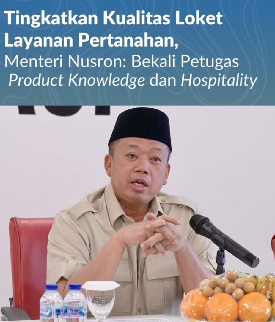 Jakarta, Jurnal Minang. Untuk meningkatkan kualitas loket layanan pertanahan, Menteri Agraria dan Tata Ruang/Kepala Badan Pertanahan Nasional (ATR/BPN), Nusron Wahid, menekankan pentingnya pembekalan product knowledge dan hospitality bagi petugas loket. Menurutnya, peningkatan kapasitas tersebut perlu dibarengi dengan sinkronisasi antara loket pelayanan dan back office di Kantor Pertanahan agar pelayanan kepada masyarakat dapat berjalan optimal.