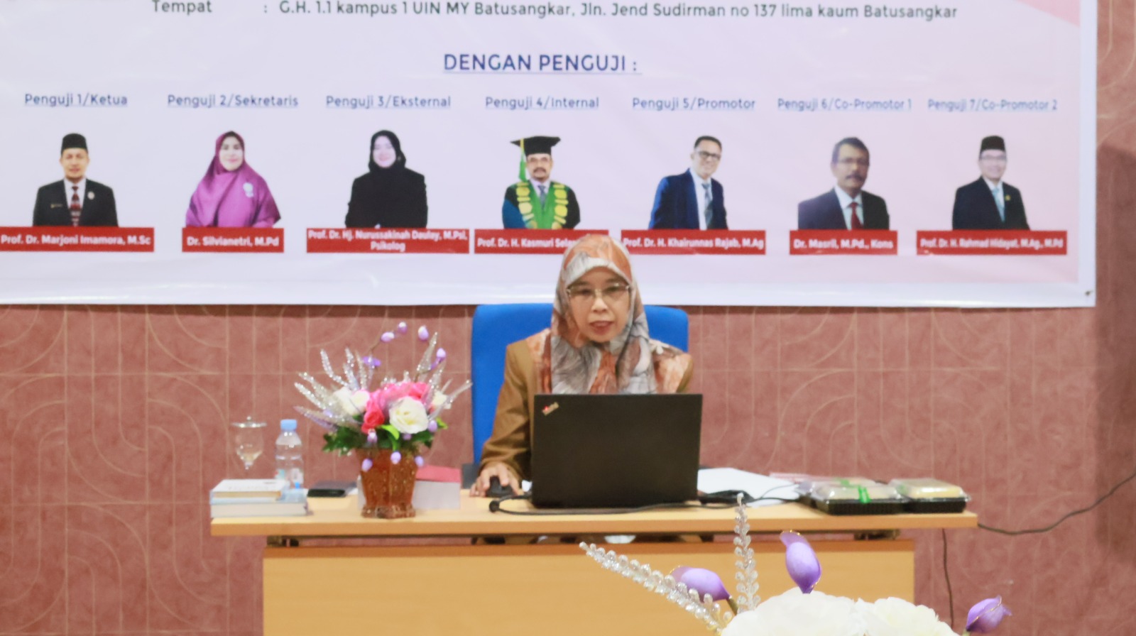 Ujian tertutup tersebut dilaksanakan di hadapan tim penguji yang terdiri dari Prof. Dr. Marjoni Imamora, M.Sc (Ketua), Prof. Dr. H. Rahmad Hidayat, M.Ag., M.Pd (Sekretaris), Prof. Dr. H. Khairunnas Rajab, M.Ag (Penguji Eksternal), Prof. Dr. H. Kasmuri Selamat, MA (Penguji Internal), Prof. Delmus Purneri Salim, M.A., M.Res (Promotor), Dr. H. M. Yusuf Salam, S.Ag., MA (Co-Promotor I), dan Dr. H. Akhyar Hanif, M.Ag (Co-Promotor II).