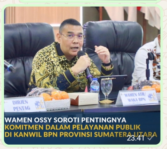 Sumatera Utara , Jurnal Minang. Wakil Menteri Agraria dan Tata Ruang/Wakil Kepala Badan Pertanahan Nasional (Wamen ATR/Waka BPN), Ossy Dermawan, menekankan pentingnya peningkatan kualitas layanan pertanahan kepada masyarakat. Dalam kunjungannya ke Kantor Wilayah BPN Provinsi Sumatera Utara, Kamis (02/04/2026), Wamen Ossy mengingatkan jajaran agar menjadikan pelayanan publik ini sebagai prioritas utama.