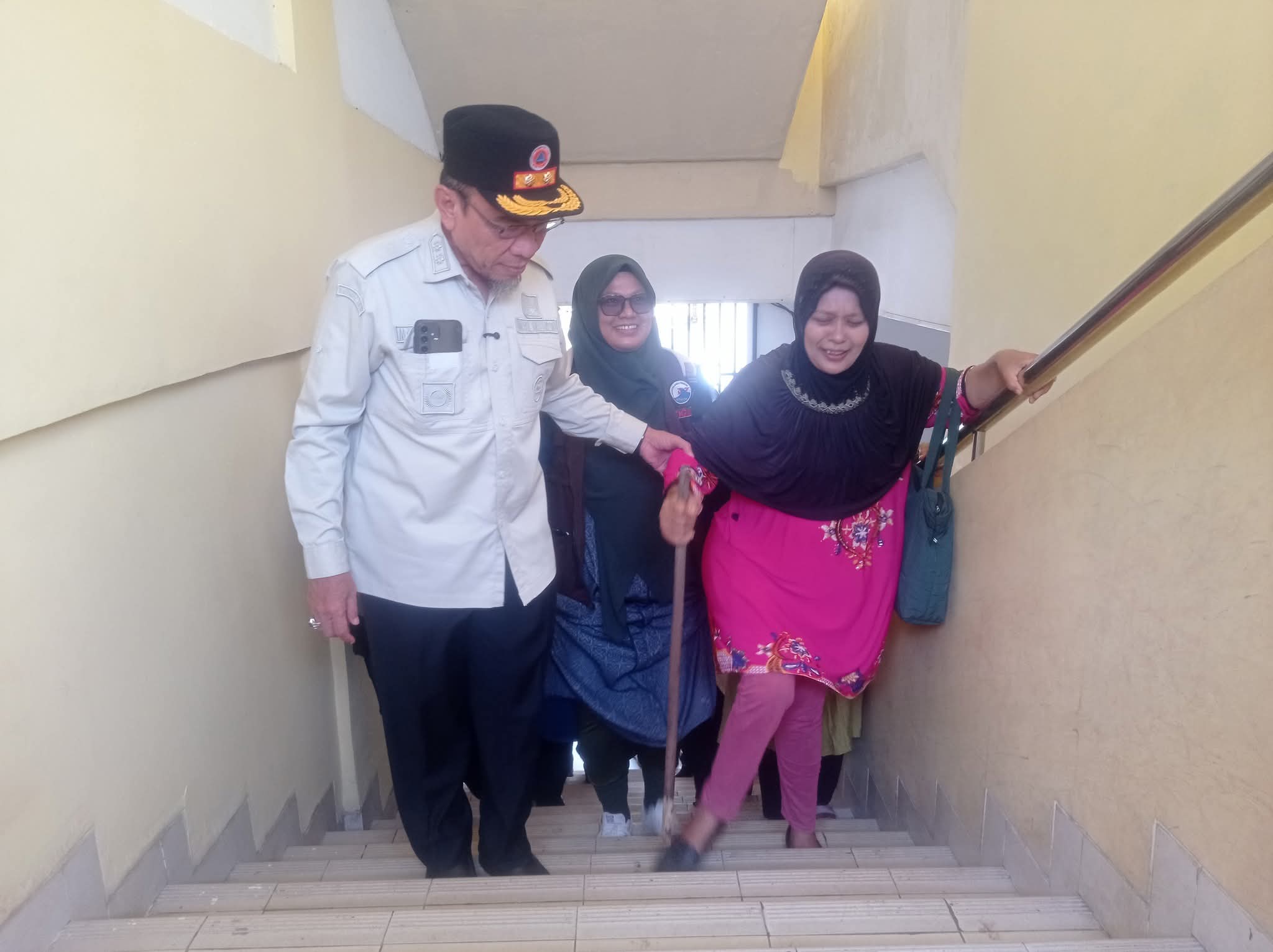 Melihat salah seorang warganya kesulitan, Wawako Maigus Nasir langsung turun membantu dengan menuntun tangannya hingga sampai ke shelter di lantai 4 gedung.