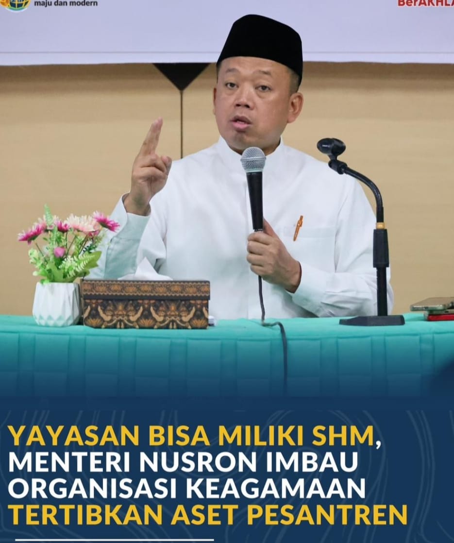 Serang, Jurnal Minang. Menteri Agraria dan Tata Ruang/Kepala Badan Pertanahan Nasional (ATR/BPN), Nusron Wahid, mengimbau organisasi keagamaan untuk memanfaatkan skema penetapan yayasan sebagai subjek hukum dalam sertipikat hak milik. Hal itu dilakukan untuk menertibkan aset pesantren dan lembaga pendidikan keagamaan. Imbauan ini disampaikan langsung di hadapan organisasi keagamaan yang ikut dalam pertemuan di Sekretariat Majelis Ulama Indonesia Provinsi Banten pada Jumat (20/02/2025).